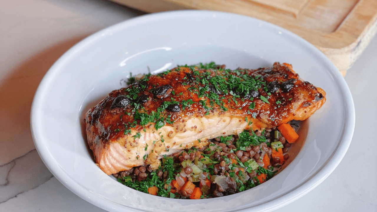 Switch it up this season with seafood! This recipe for Salmon and Lentils is packed with rich flavors, complimented by Carmelina Brands® Italian Lentils, Dijon mustard, diced carrots and celery, and a salmon filet caramelized to perfection!